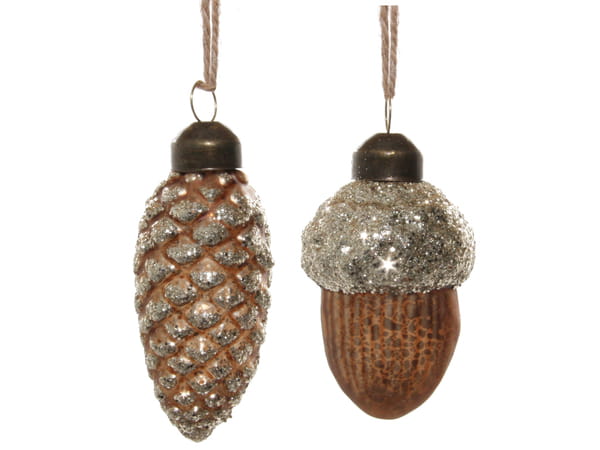 Zestaw 2 szt. szklanych zawieszek bombek (żołądź i szyszka) w brązowych kolorach z dodatkiem mieniącego się brokatu.