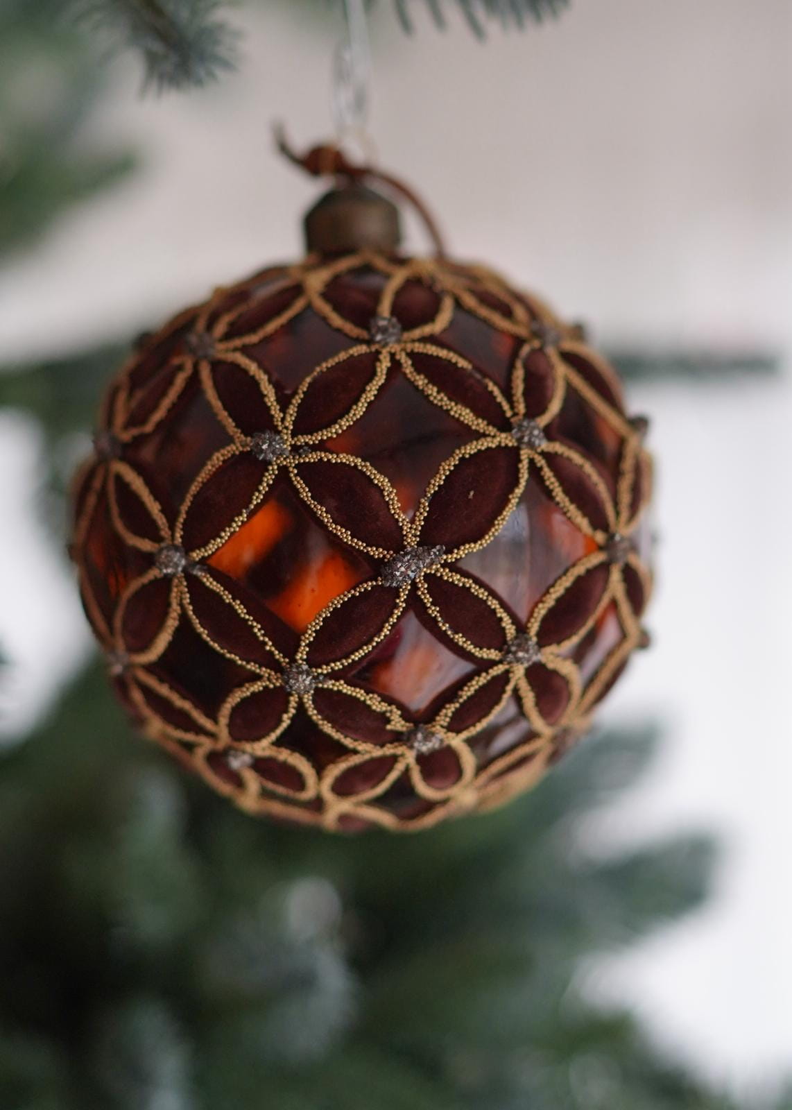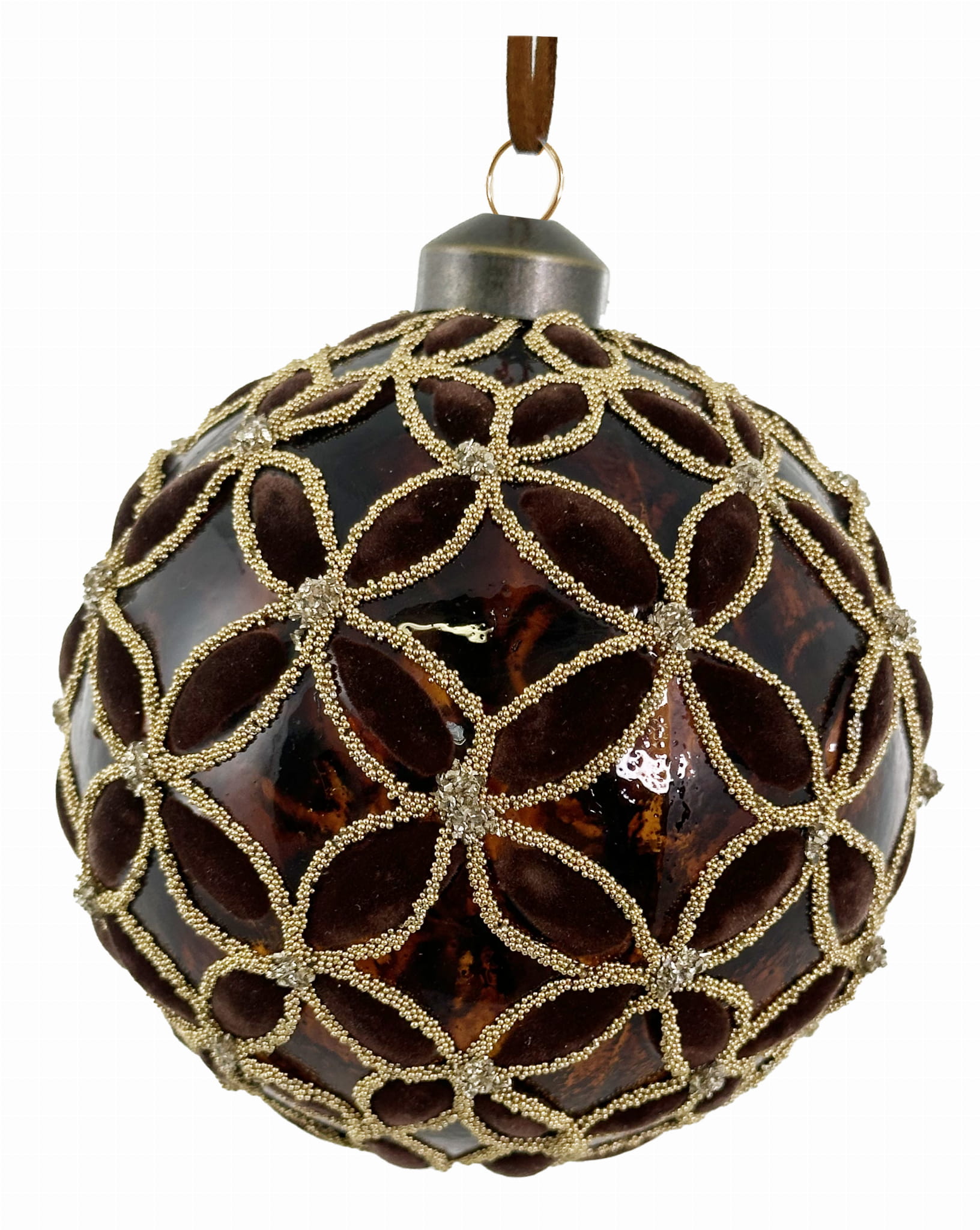 2 szklane bombki choinkowe z dodatkiem brązowego weluru, 10 cm