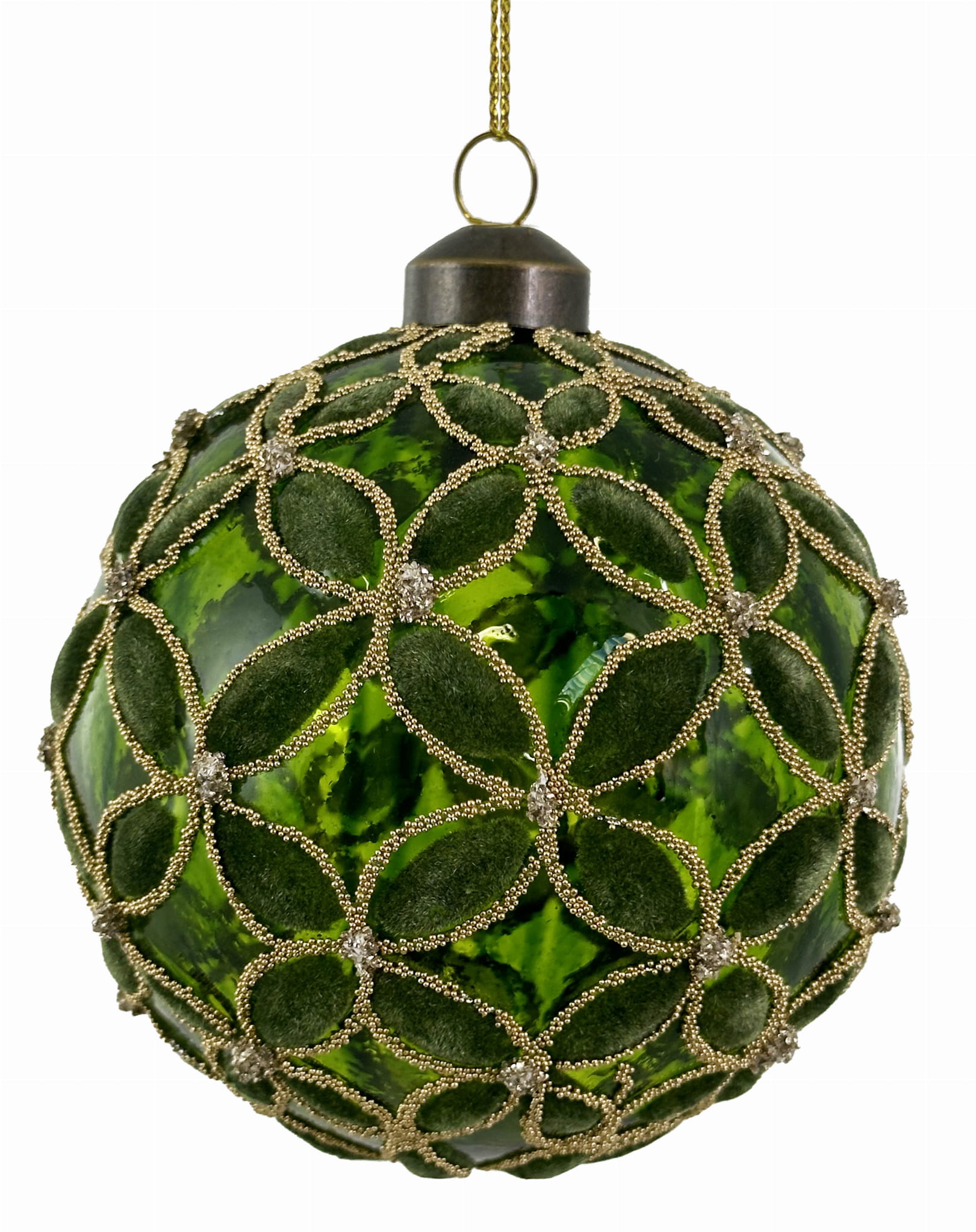 Szklana bombka z oryginalnym, eleganckim wzorem. Bombka ozdobiona jest aksamitnym flokowaniem, co nadaje jej luksusowy wygląd, który uświetni każdą świąteczną dekorację.