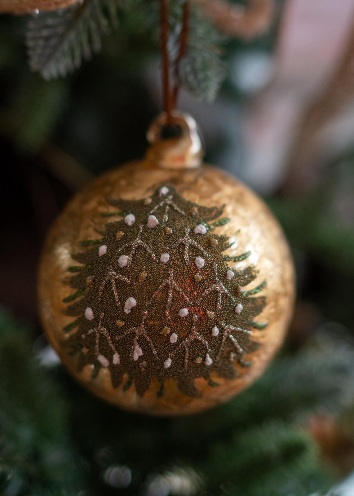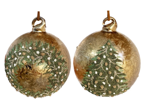 Zestaw 2 szt. bombek w kolorze palonego złota z pięknym zielonym ornamentem w kształcie wianka i choinki.