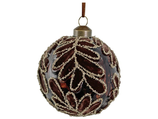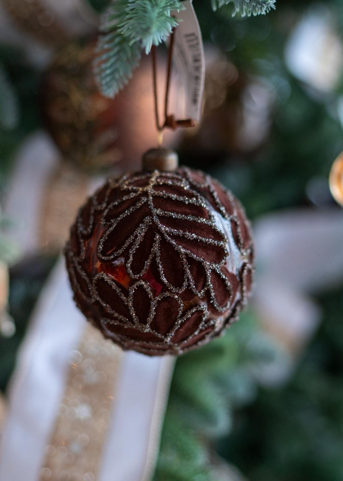 2 szklane bombki z wzorem aksamitnych brązowych liści, 10 cm