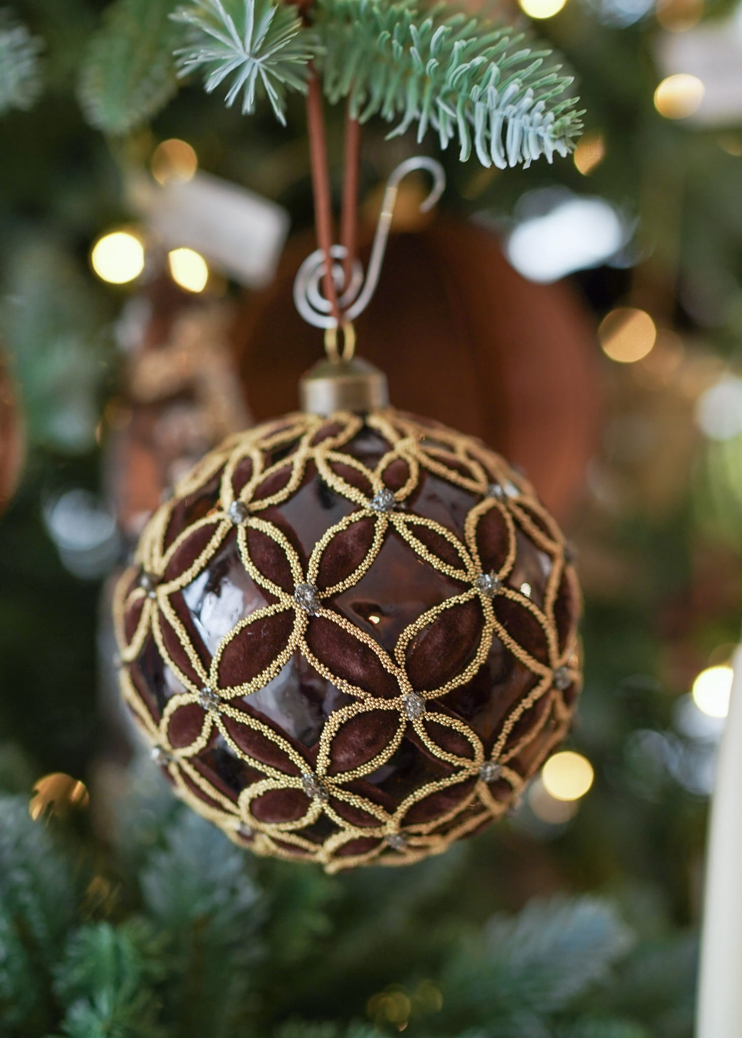 4 szklane bombki choinkowe z dodatkiem brązowego weluru, 8 cm