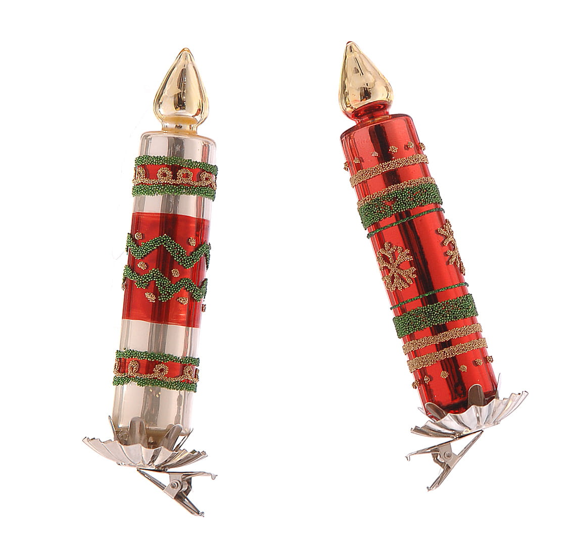 Bombka świeczka ze zdobieniem na klipsie czerwień- zieleń, 2 szt. 13 cm