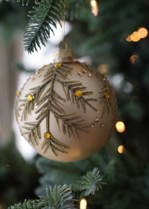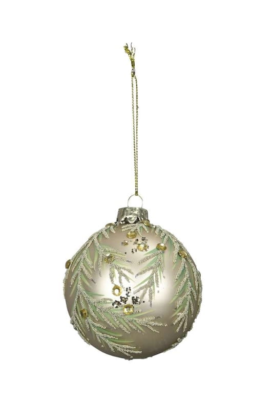 Bombka szklana w kolorze szampańskim z zieloną gałązką igliwia