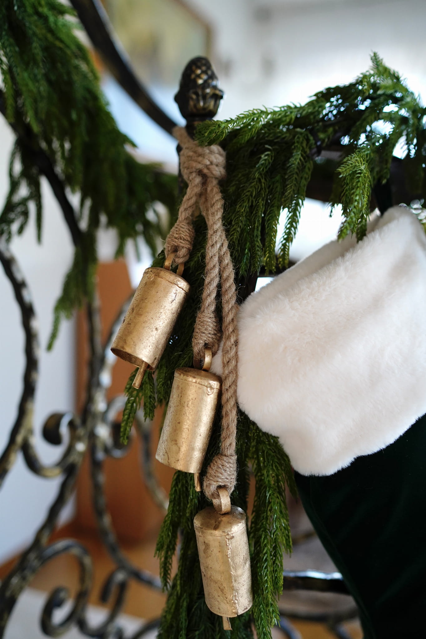 Dzwonki świąteczne złote w stylu Vintage COW BELLS (wąskie) , wiszące na sznurku jutowym, 3 dzwonki - rozmiar L
