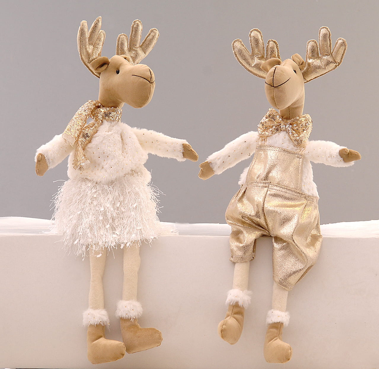 Urocza para siedzących reniferów wykonana z wysokiej jakości materiałów. Idealne do ozdoby salonu, ustawienia przy choince lub rozświetlającego ciepłem kominka.