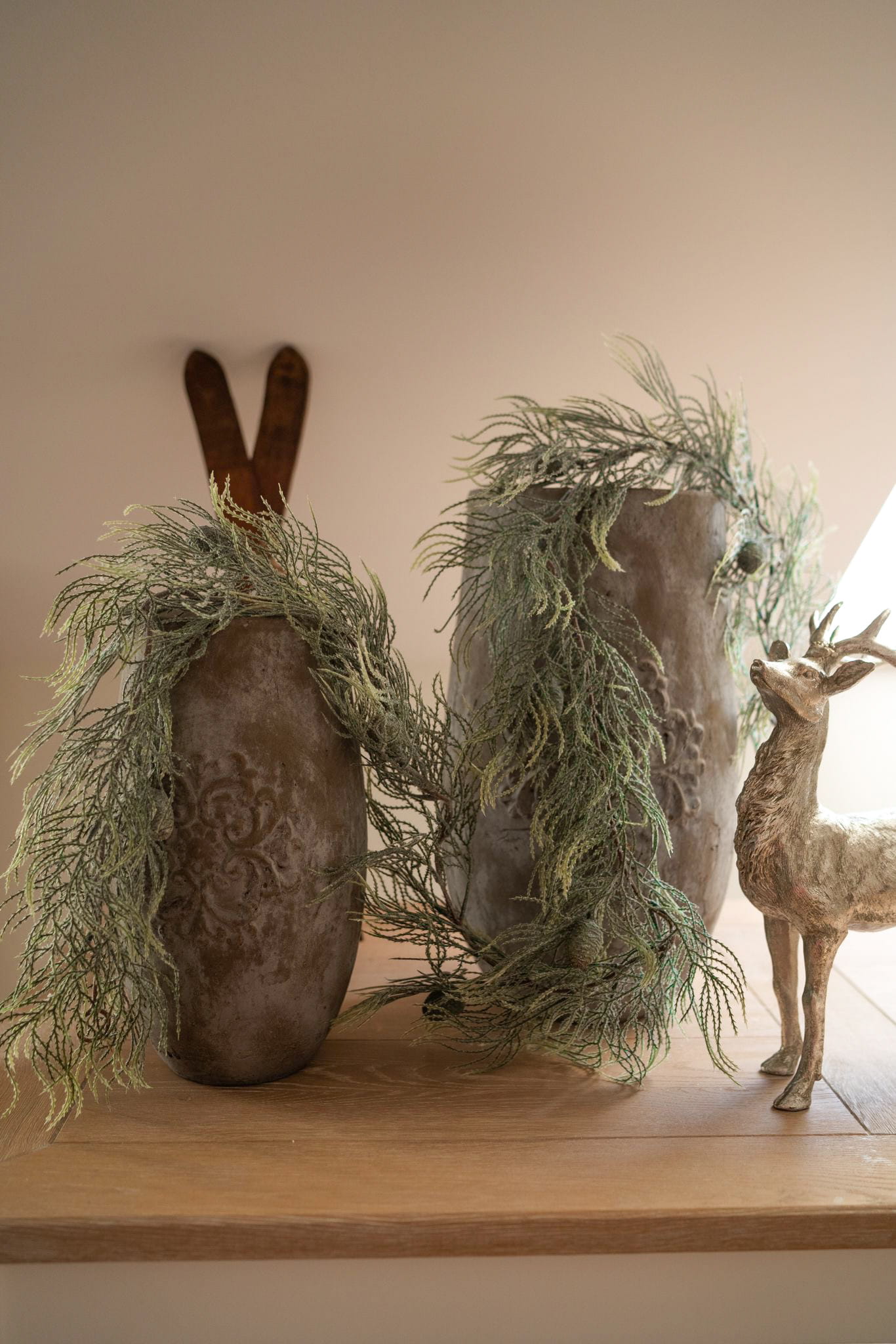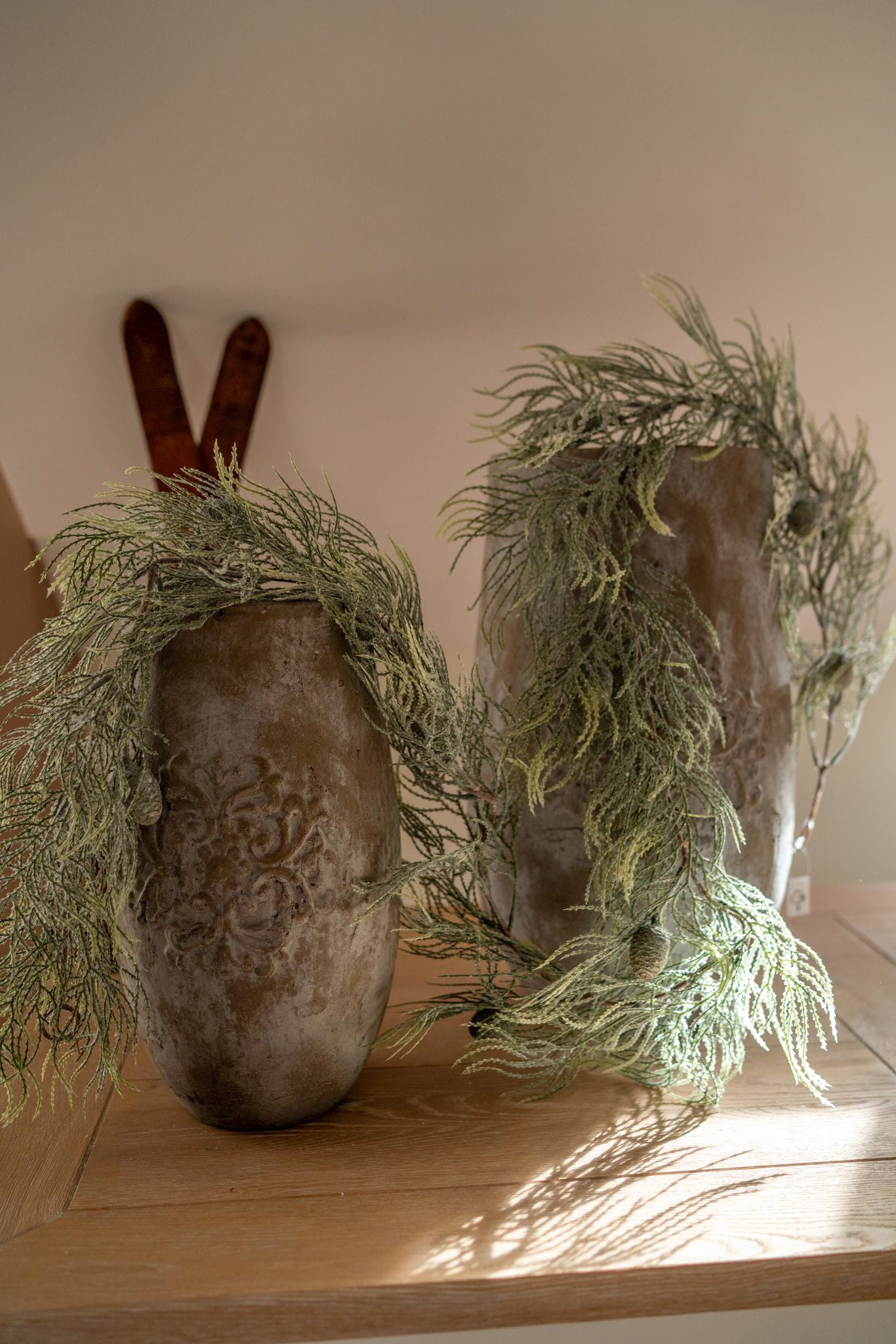 Dekoracyjna girlanda z zielonych gałązek cyprysu, pokrytych delikatnym, błyszczącym szronem z dodatkiem zielonych szyszek – idealna do stworzenia magicznej, świątecznej atmosfery w Twoim domu.