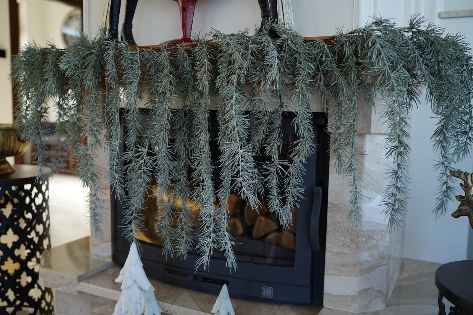 Dekoracyjna girlanda z zielonych gałązek cedru, pokrytych delikatnym, błyszczącym szronem idealna do stworzenia magicznej, świątecznej atmosfery w Twoim domu.