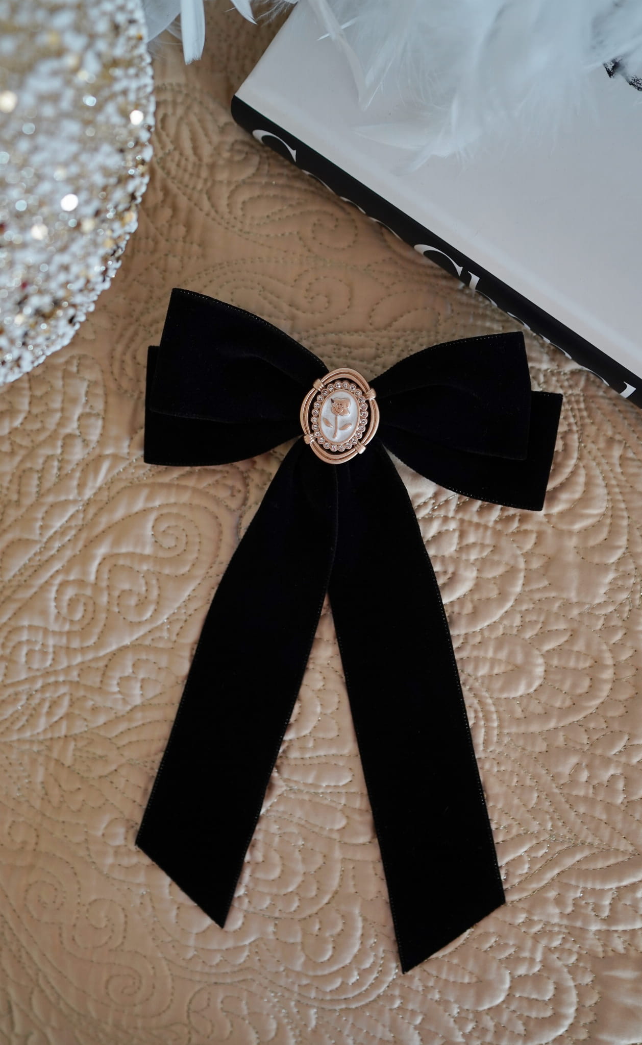 Czarna kokarda welurowa z emblematem. Zapięcie z tyłu