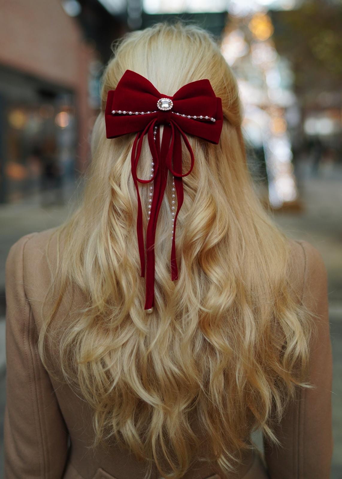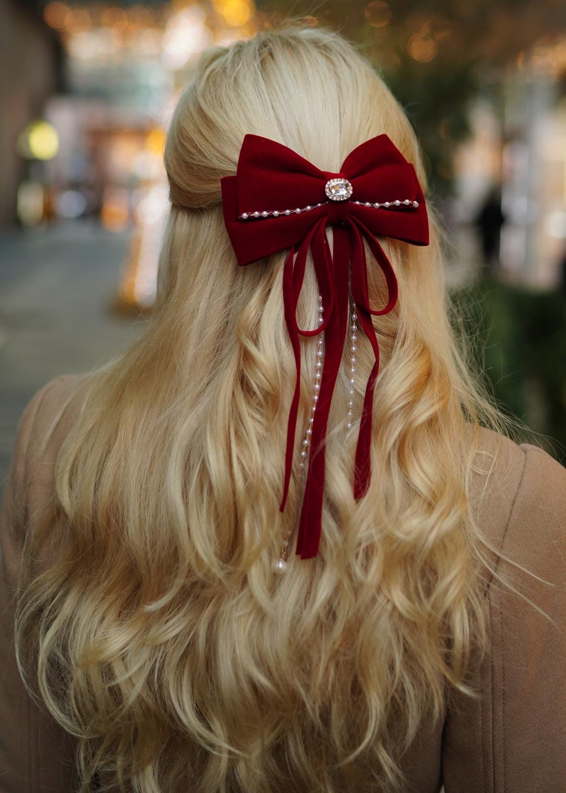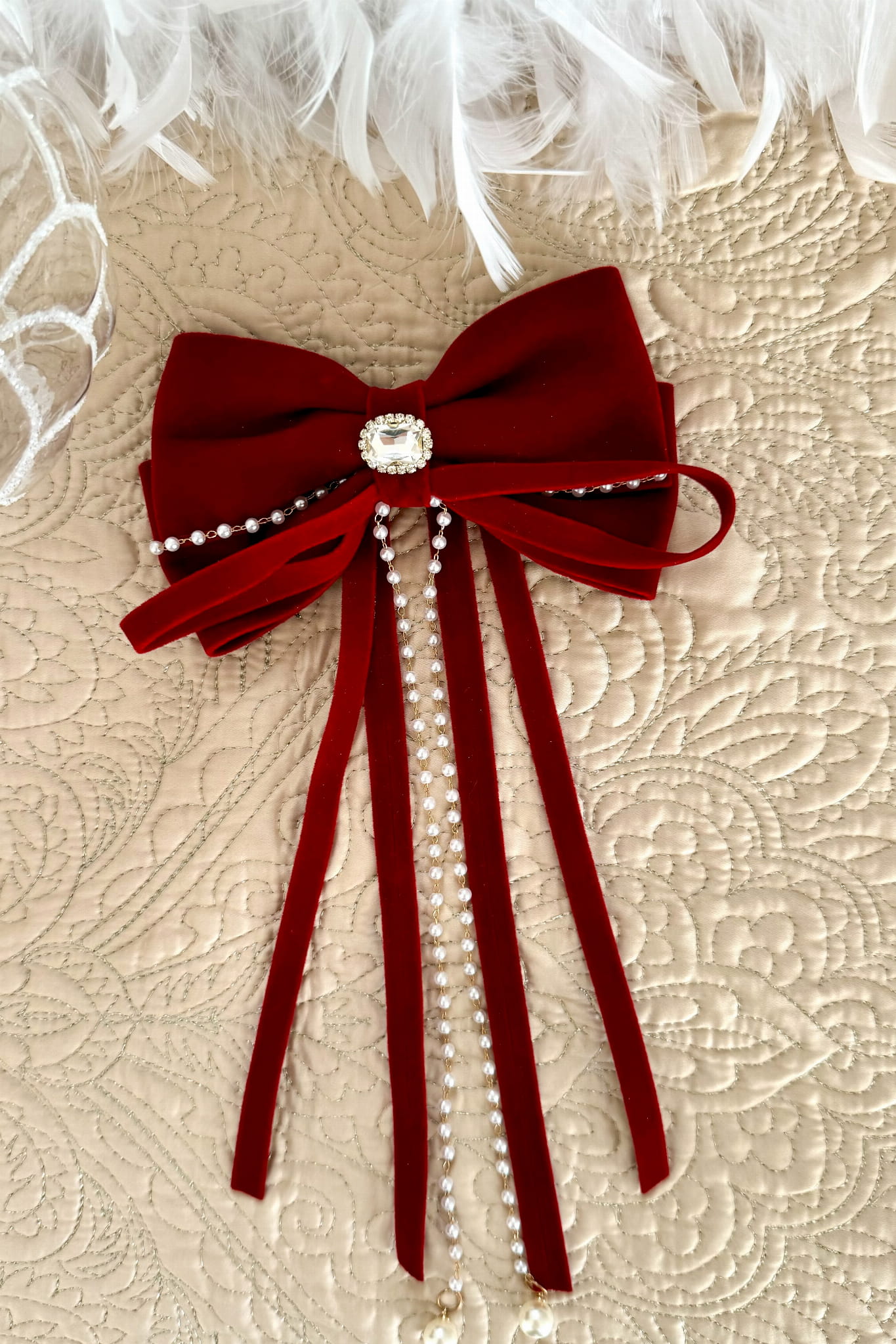 Welurowa kokarda do włosów w kolorze czerwonym z perełkowo- złotym, zwisającym zdobieniem. Zapięcie z tyłu.