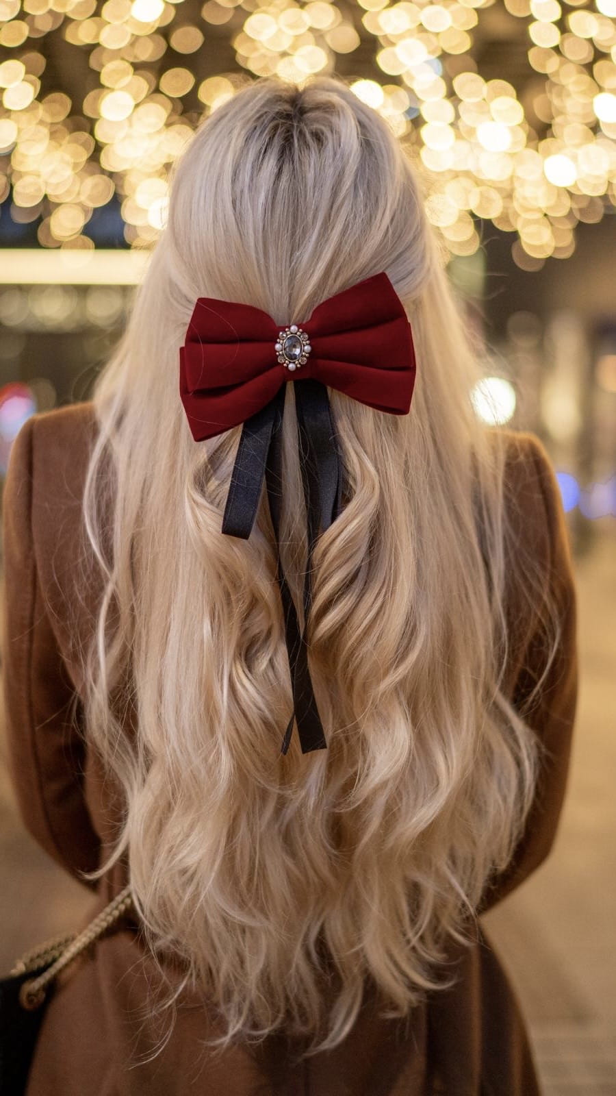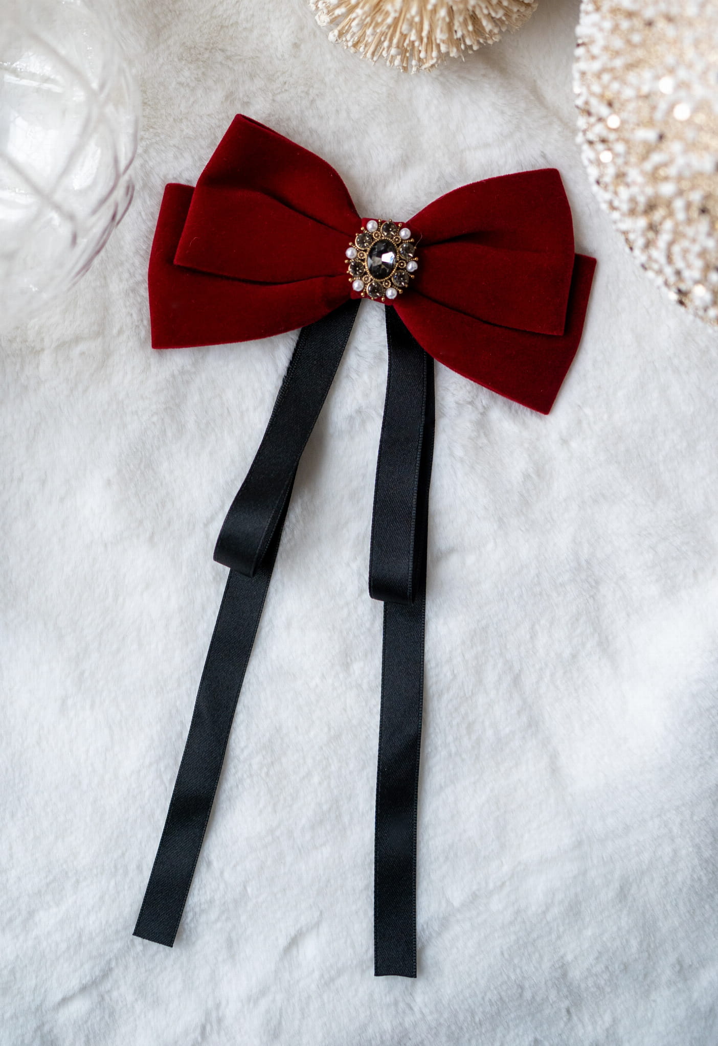 Welurowa, czerwona kokarda do włosów z efektownym kamieniem po środku i satynowymi, czarnymi frędzlami. Zapięcie z tyłu.