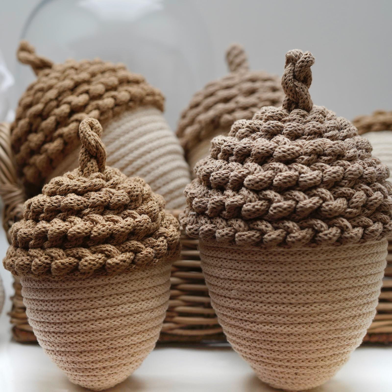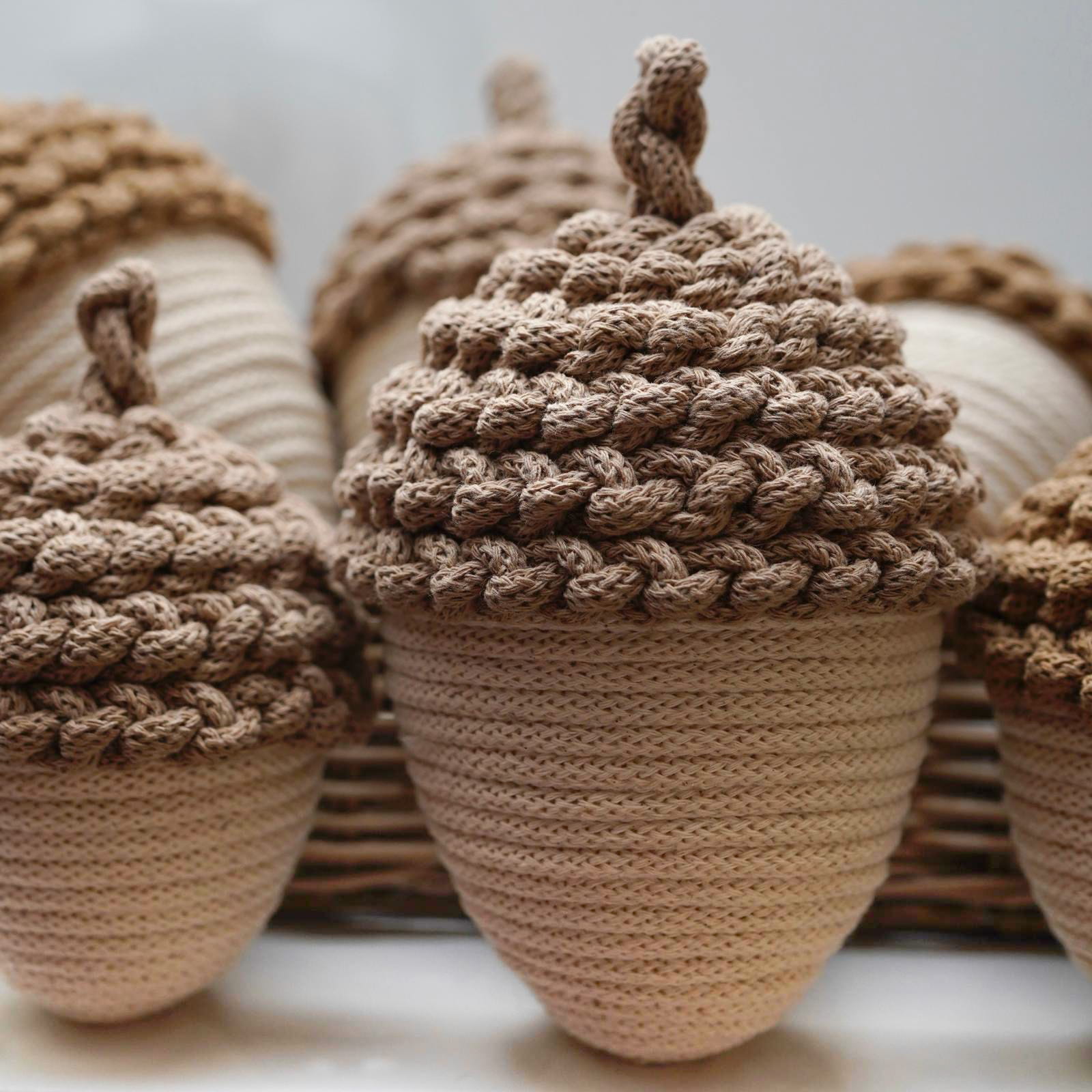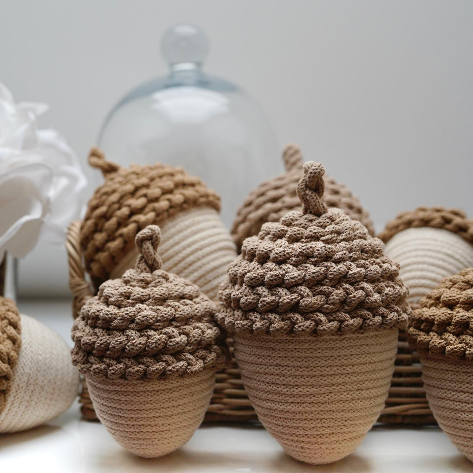 Dodaj odrobinę jesiennego uroku do swojego wnętrza dzięki tym ręcznie wykonanym ozdobnym żołędziom ze sznurka w delikatnym kremowym kolorze. Każdy żołądź to efekt pracy z naturalnych materiałów, które tworzą wyjątkową atmosferę.