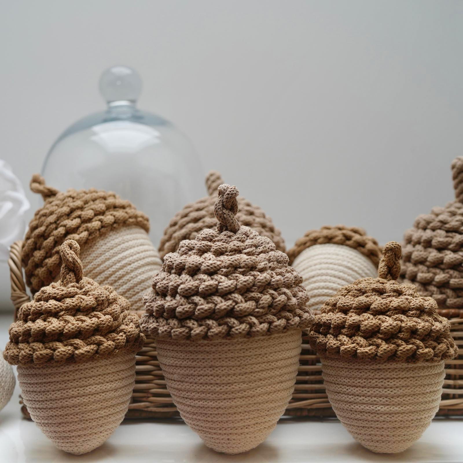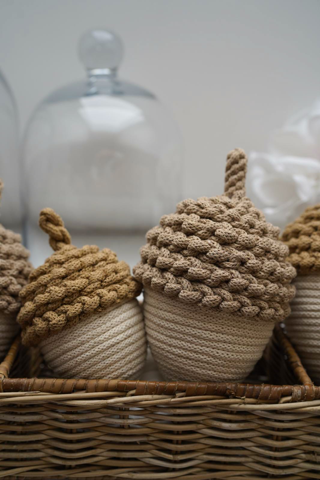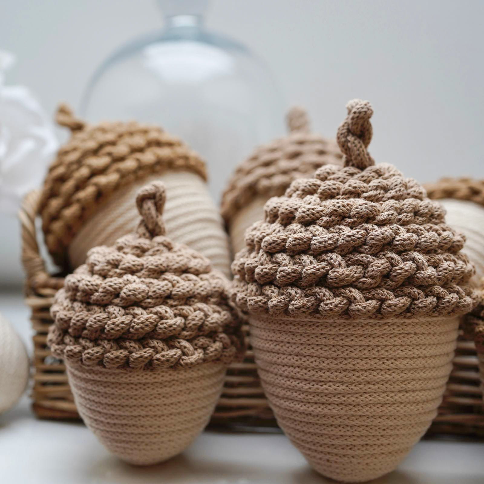 Dodaj odrobinę jesiennego uroku do swojego wnętrza dzięki tym ręcznie wykonanym ozdobnym żołędziom ze sznurka w delikatnym kremowym kolorze. Każdy żołądź to efekt pracy z naturalnych materiałów, które tworzą wyjątkową atmosferę.