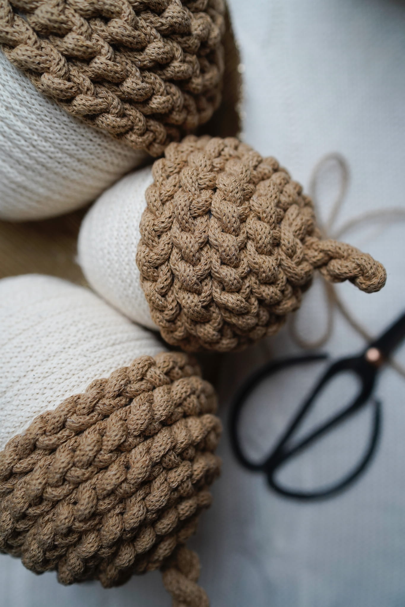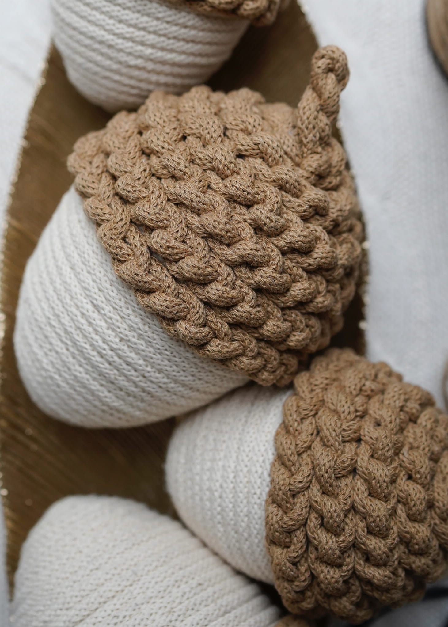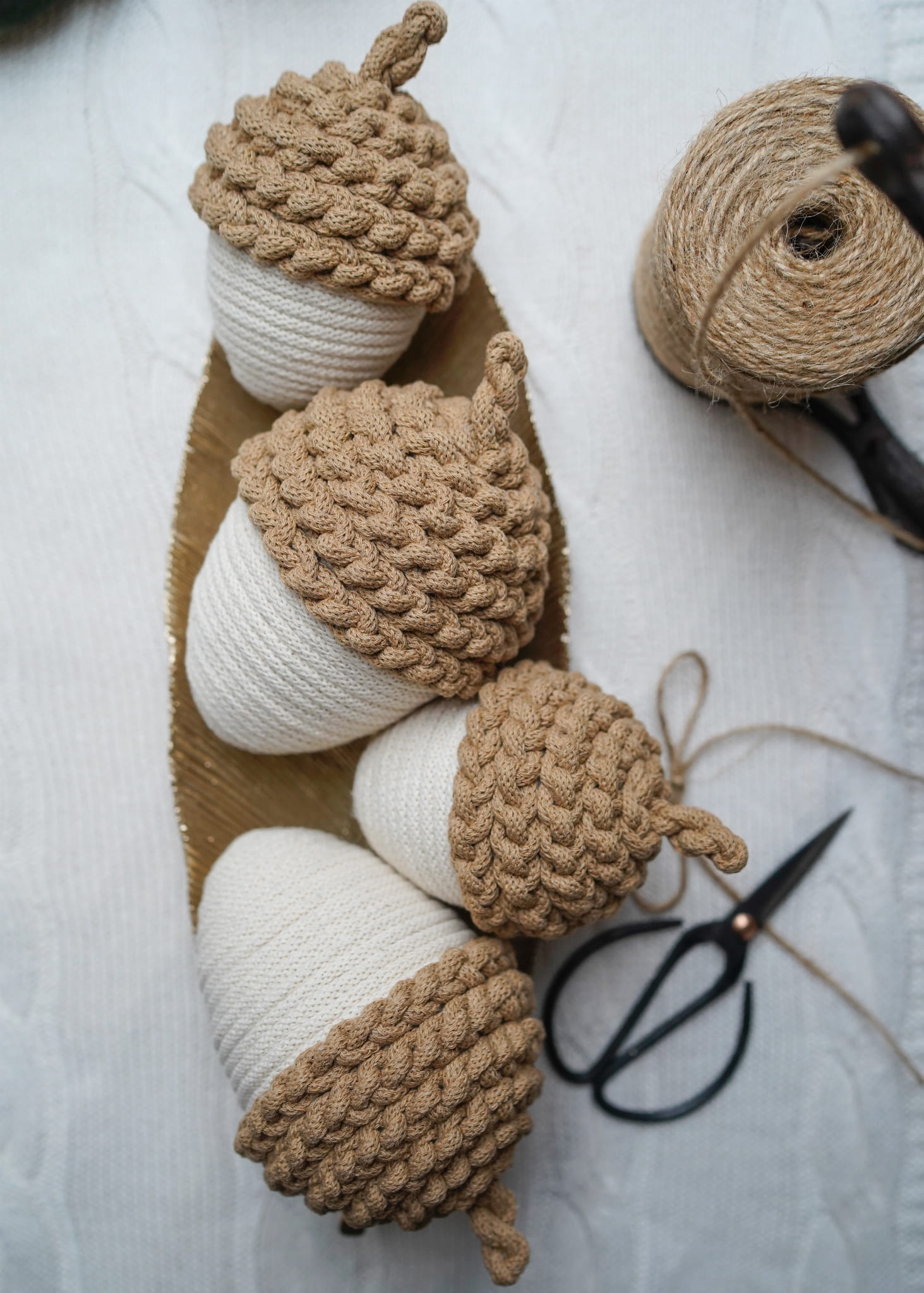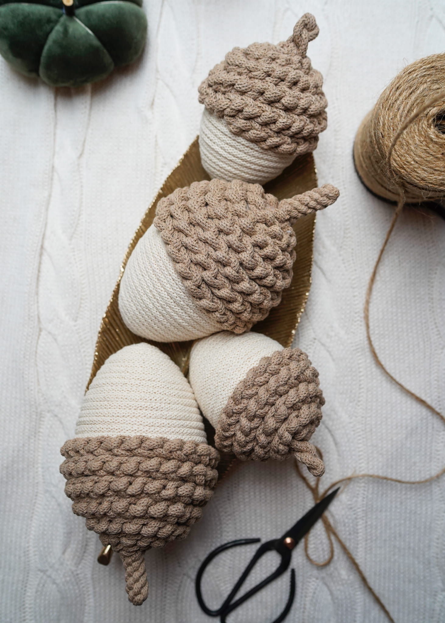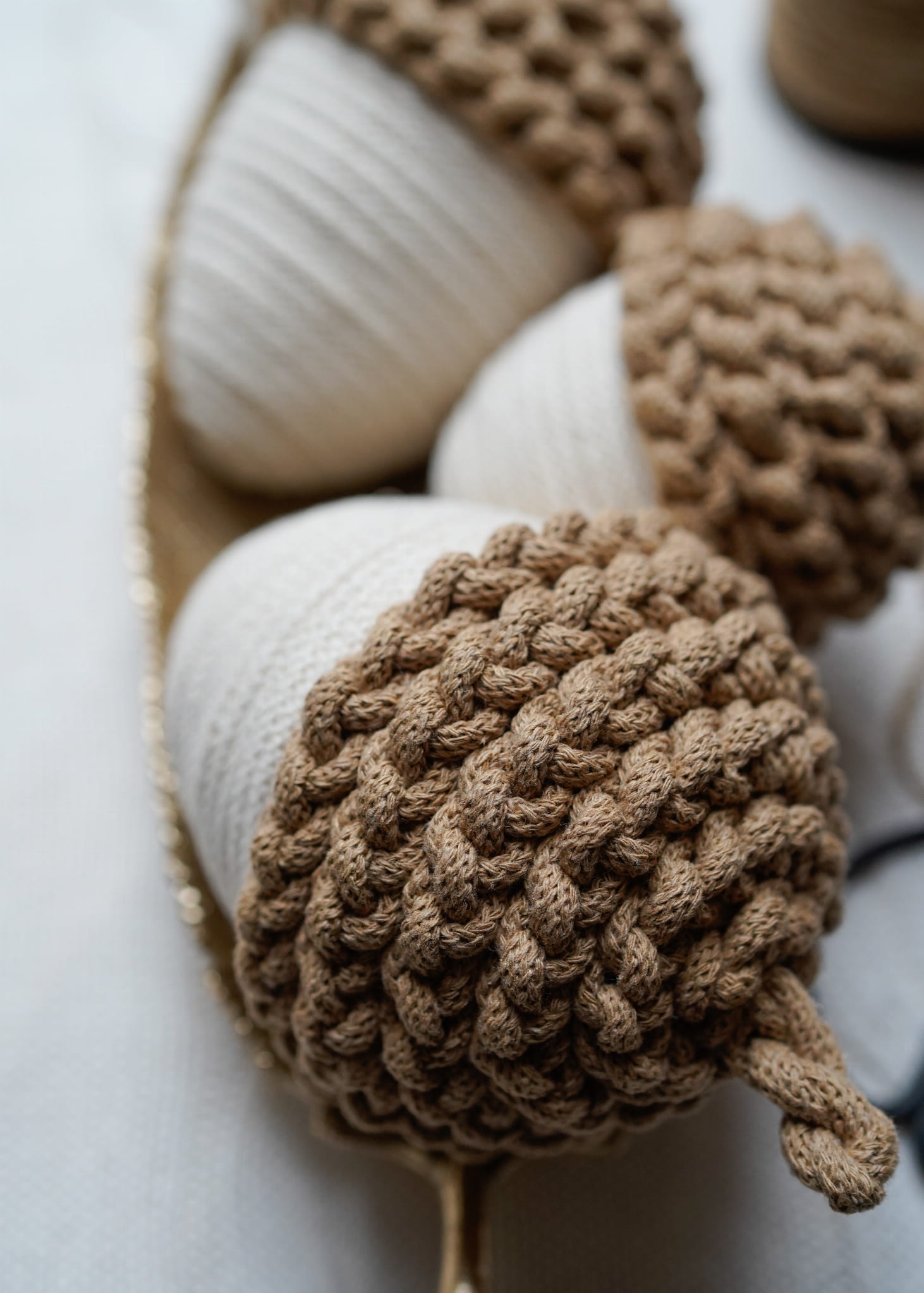 Ręcznie wykonane ze sznurka żołędzie idealne jako dodatek do tworzenia jesiennych dekoracji i aranżacji.