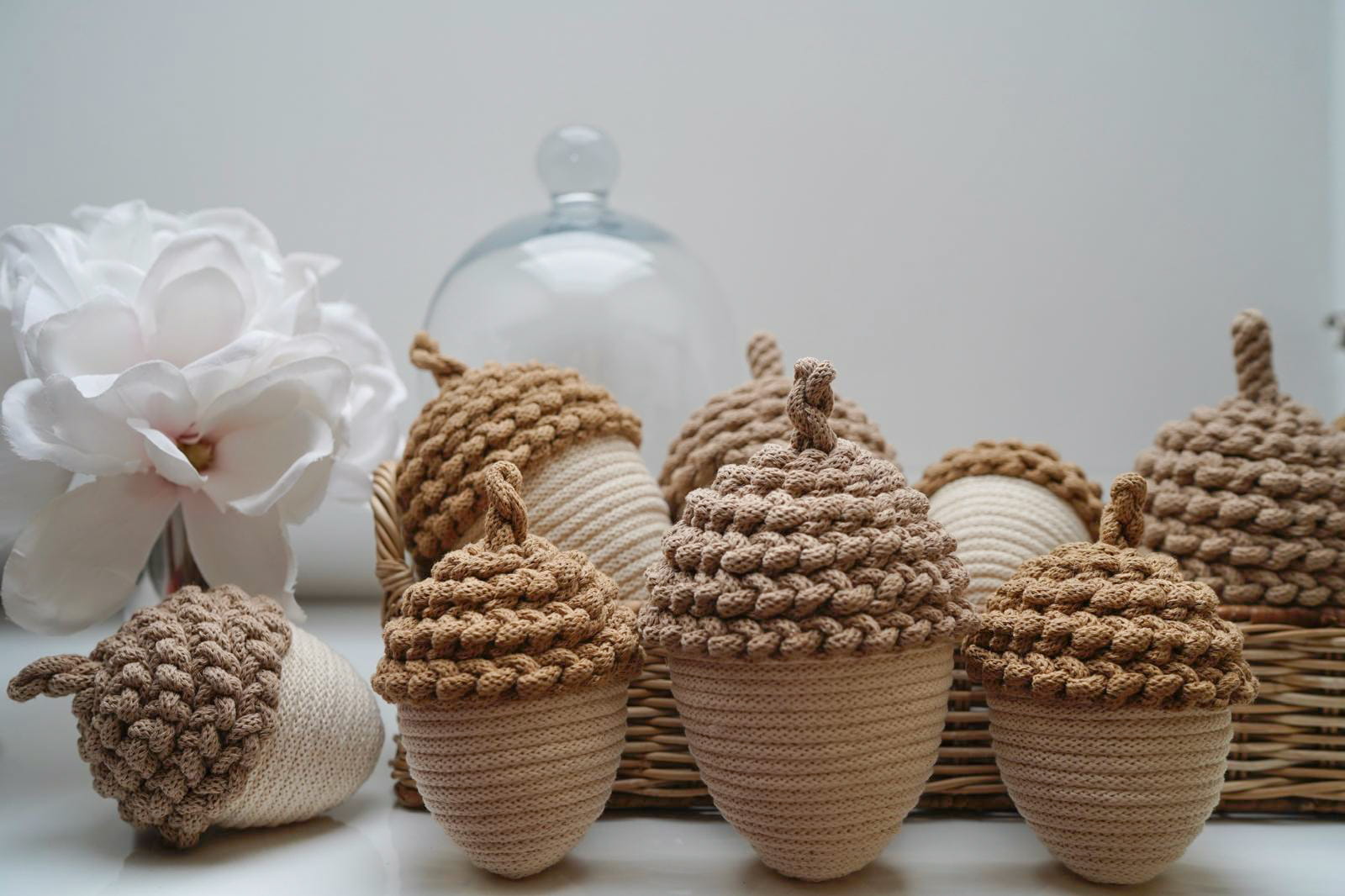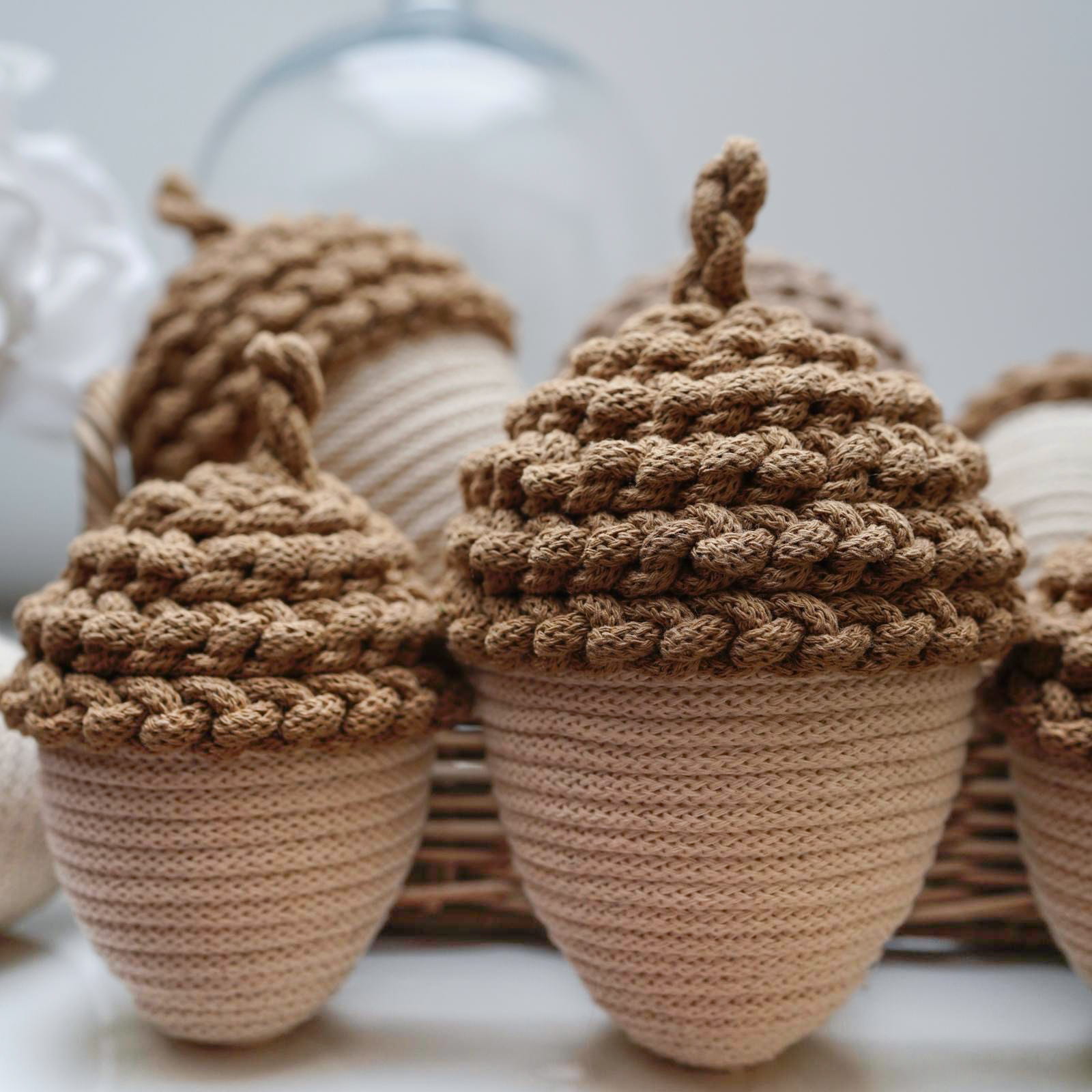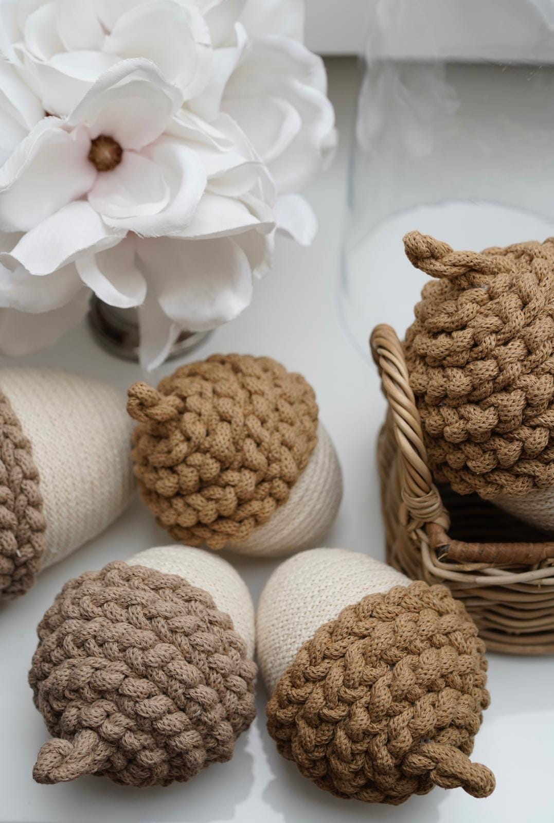 Dodaj odrobinę jesiennego uroku do swojego wnętrza dzięki tym ręcznie wykonanym ozdobnym żołędziom ze sznurka w delikatnym kremowym kolorze. Każdy żołądź to efekt pracy z naturalnych materiałów, które tworzą wyjątkową atmosferę.
