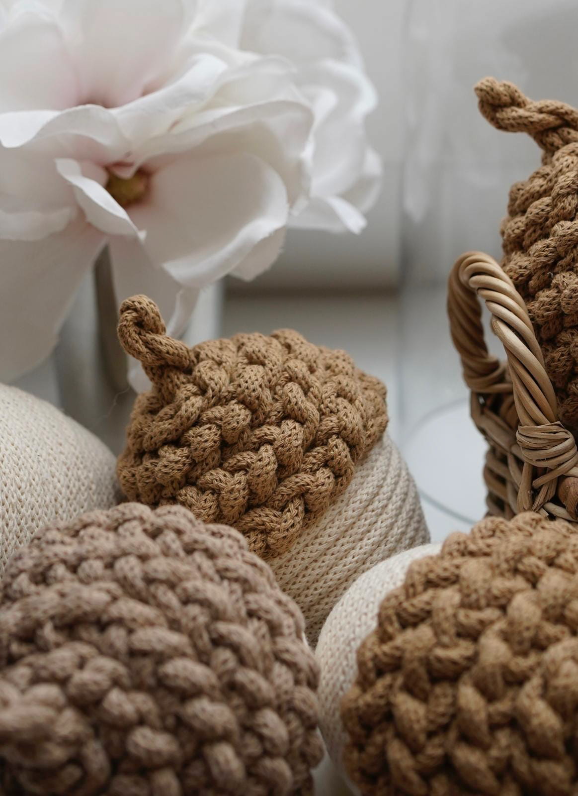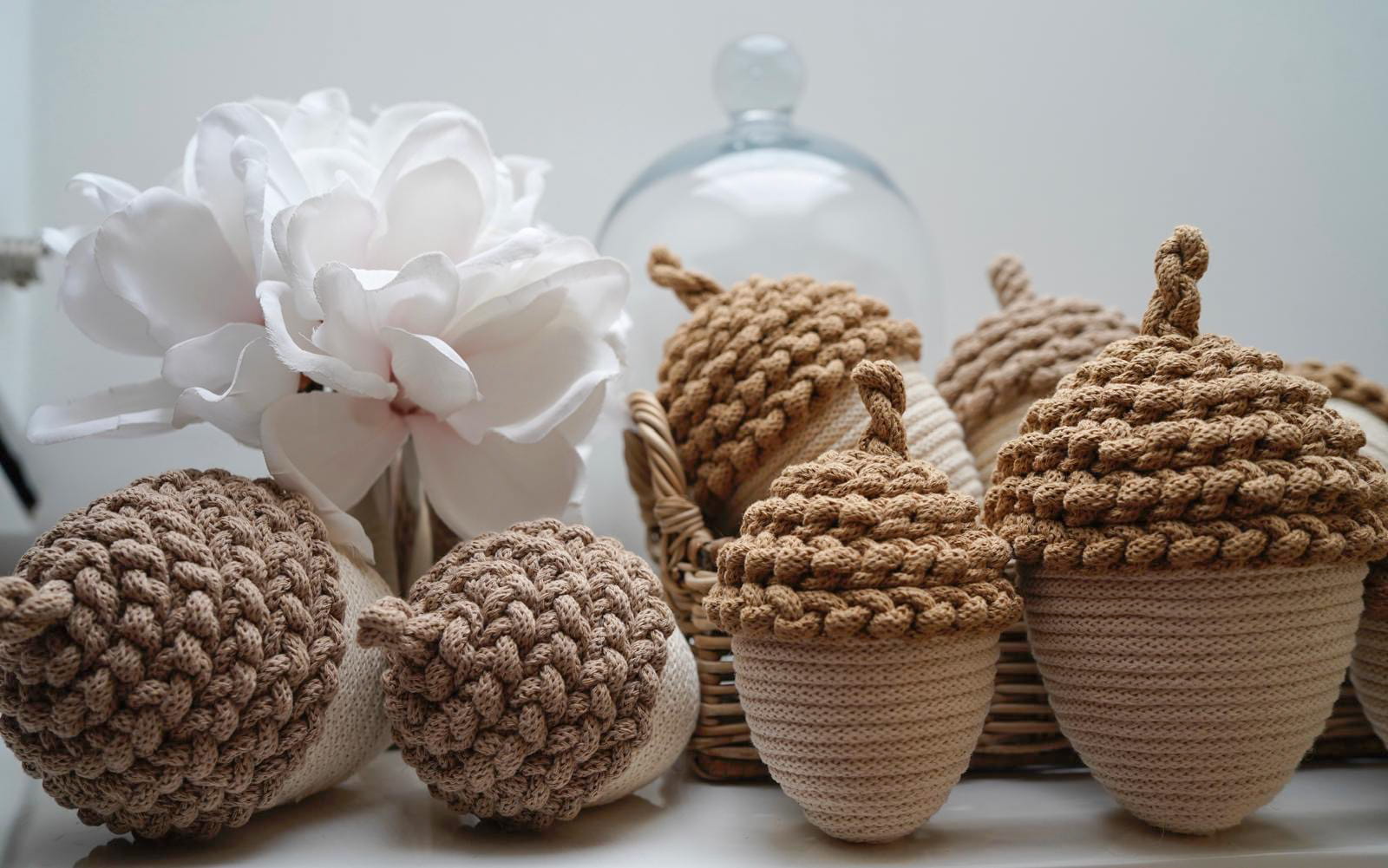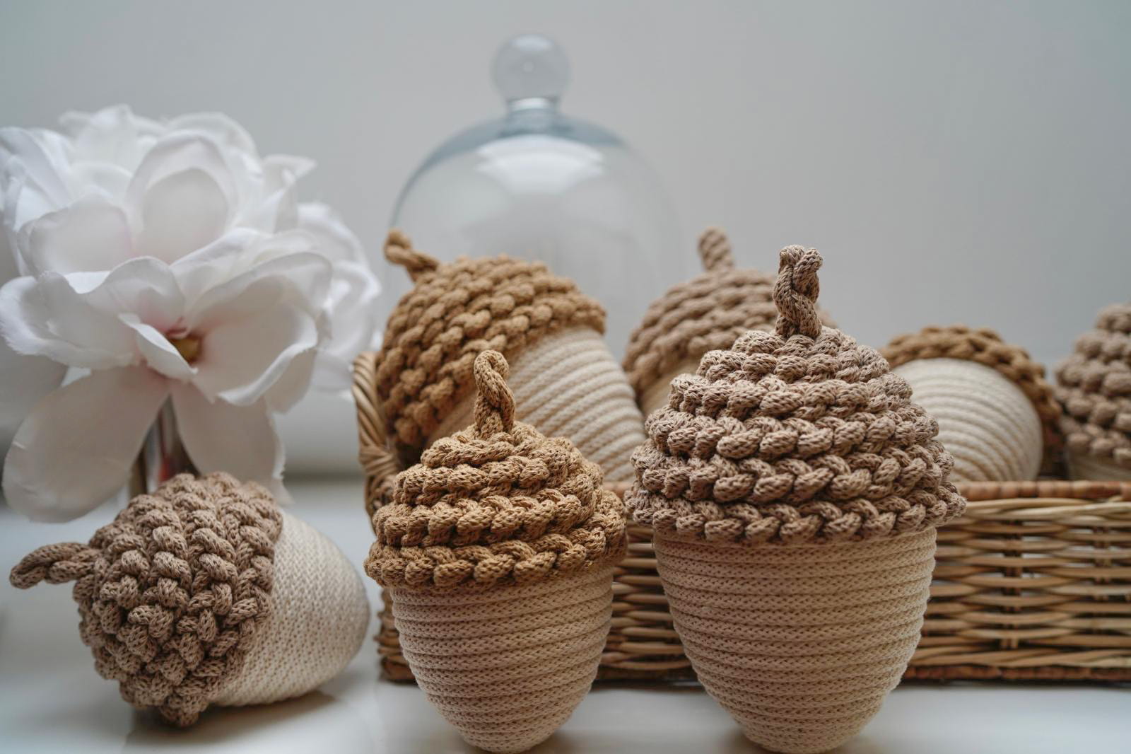 Dodaj odrobinę jesiennego uroku do swojego wnętrza dzięki tym ręcznie wykonanym ozdobnym żołędziom ze sznurka w delikatnym kremowym kolorze. Każdy żołądź to efekt pracy z naturalnych materiałów, które tworzą wyjątkową atmosferę.